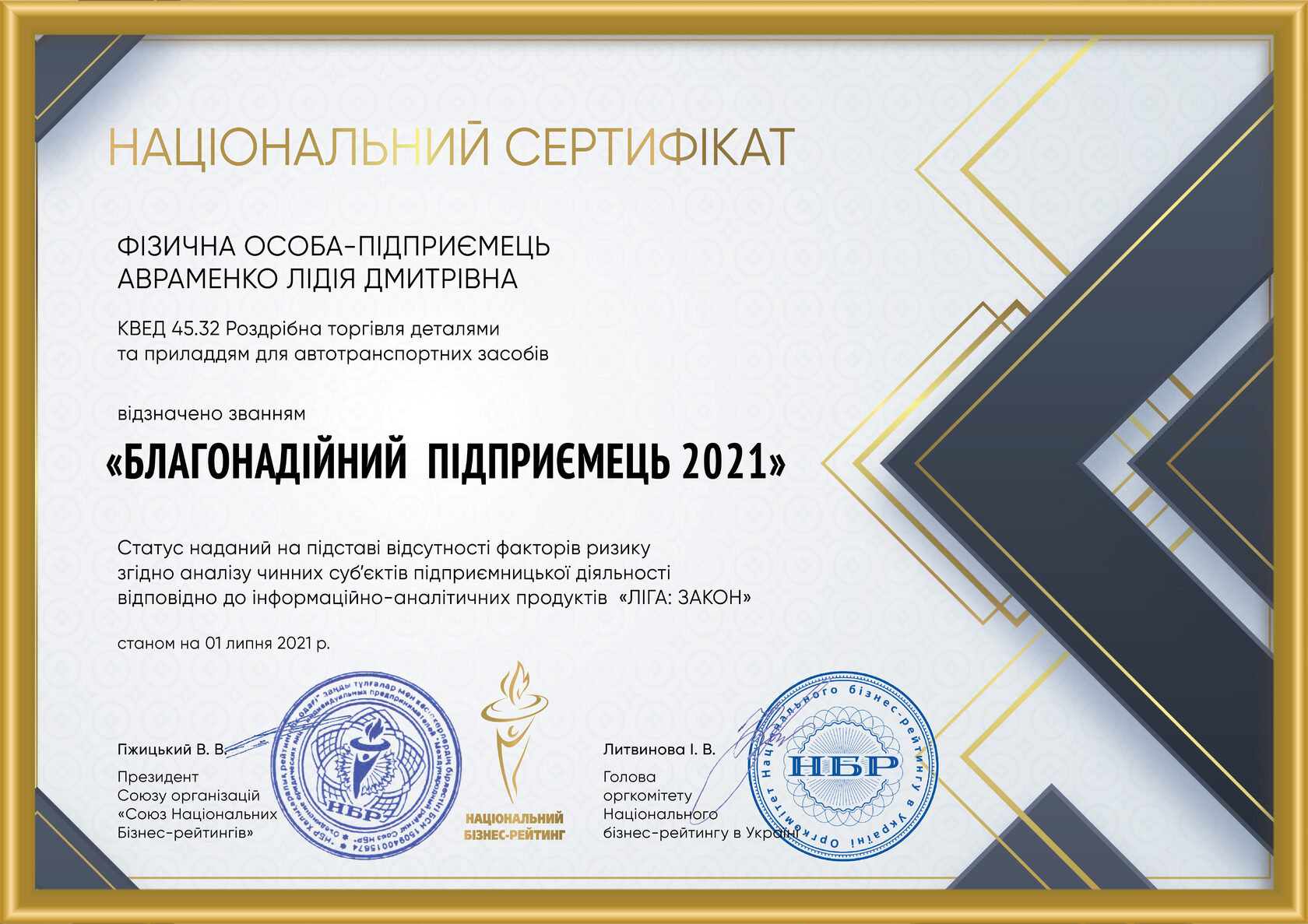 Національний сертифікат «Благонадійний підприємець 2021» підтверджує Вашу надійність як підприємця і є основою у побудові довірчих відносин з партнерами, інвесторами, клієнтами.